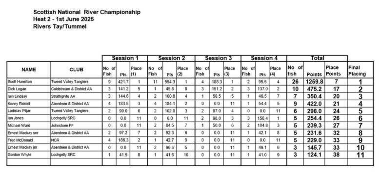 The final of the 2025 Scottish National River Championship was held on Sunday 27th July on the Rivers Tay and Tummel. Fourteen competitors took part and over the four sessions they caught a total of 71 fish. The top six anglers make up the team for the 2026 International.