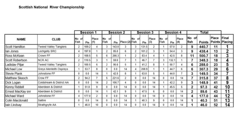 Top rod was Scott Hamilton of Tweed Valley Tanglers with an impressive catch in all four sessions with a total of 26 fish and 7 place points. Dick Logan of Coldstream & District AA was second with 17 place points and Iain Lindsay of Strathgryfe AA was third with 20 place points.