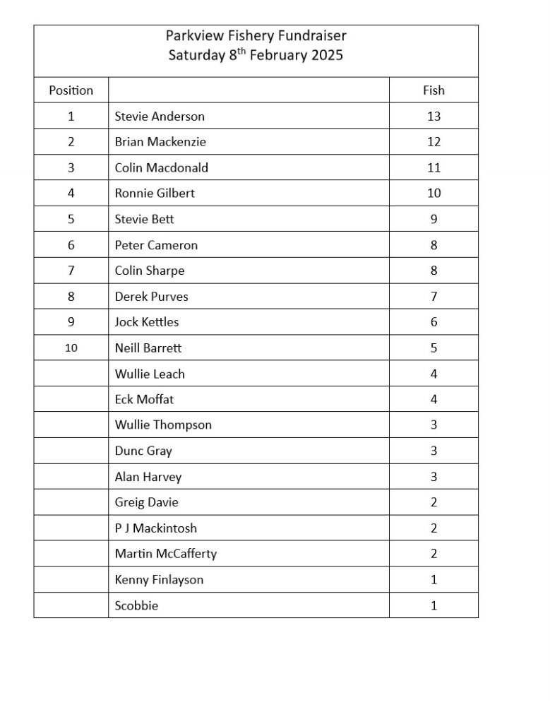 The 2025 International teams wish to thank Wullie Simpson along with Jim and Edna at the Parkview Fishery for running a fundraiser for them at Parkview. They also wish to thank French Vehicle Services, David Bonnington Joinery, Ian Hutcheon, Smith Street Motors, and Allan Smith for sponsoring pegs and everyone who donated prizes, Angus Angling and Fishers Direct for providing vouchers for prizes and everyone who bought raffle tickets. The twenty anglers had wind, rain and sun and at the end of the day they netted 114 fish.